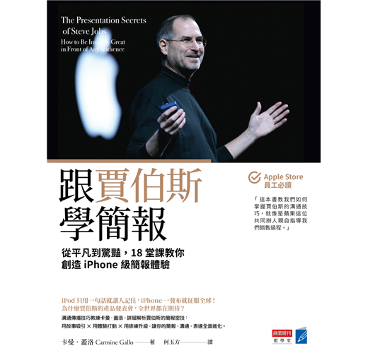 賈伯斯的簡報方式,讓產品發表會成為「科技界的好萊塢大片」,因為他不只是說服,而是讓觀眾參與,帶來強烈的興奮與共鳴。──劉奕酉(鉑澈行銷顧問策略長、《看得見的高效思考》作者)
