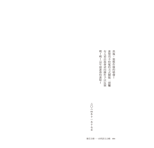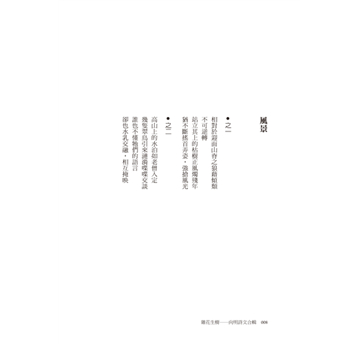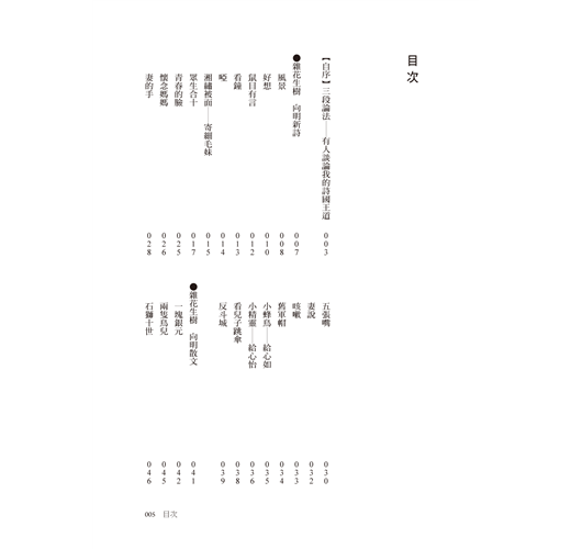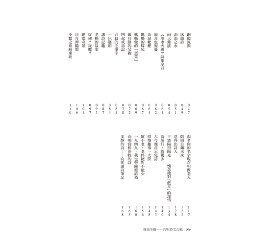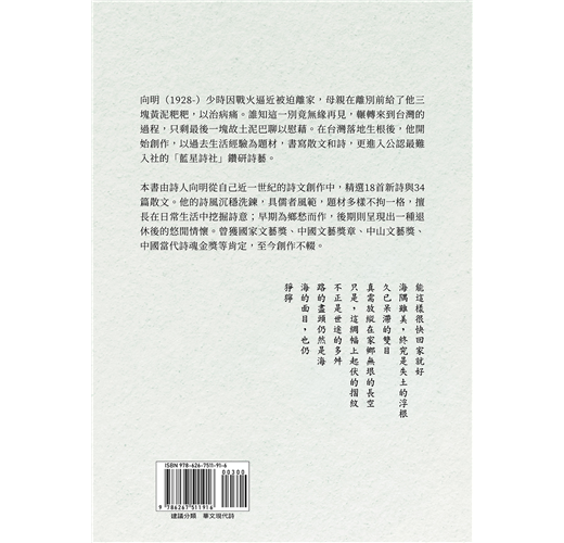 本書由詩人向明從自己近一世紀的詩文創作中,精選18首新詩與34篇散文。他的詩風沉穩洗鍊,具儒者風範,題材多樣不拘一格,擅長在日常生活中挖掘詩意;早期為鄉愁而作,後期則呈現出一種退休後的悠閒情懷。曾獲國家文藝獎、中國文藝獎章、中山文藝獎、中國當代詩魂金獎等肯定,至今創作不輟。