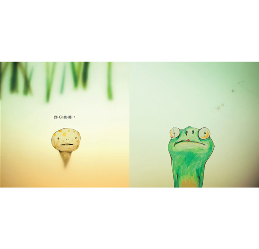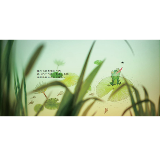 使用描圖紙搭配色鉛筆輕染上色,分別剪下角色與背景,再一層層疊在光箱上拍攝。這種技法最能細膩展現從清晨到深夜再到隔天早晨的池塘色彩變化,也特別適合表現還像嫩芽般稚嫩的青蛙哥哥、總是半浸在水中的蝌蚪弟弟們與水草,以及青蛙哥哥那華麗(?)的舌頭動作與蒼蠅激烈的掙扎。
