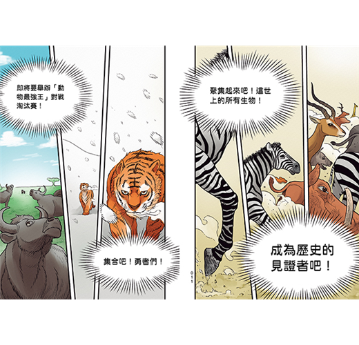 本書的第一回合將由四組動物輪流上場對戰,而速度、智慧、力量、反應力等,都將成為牠們對戰的武器,誰勝誰負無法由種類、體型及既有印象來判斷,戰鬥過程中可了解牠們各別的真實特性。此外,描述其過往的回憶畫面,也成為牠們在戰場上奮鬥的重要力量……