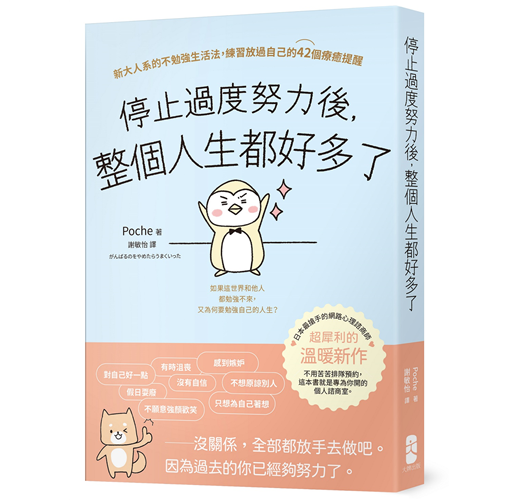 本書的存在就像是一間專為患有「過度努力症」讀者而開的犀利診療室,以42個「人生不用那麼努力也沒關係」的療癒提醒為處方簽,解答所有關於「不自覺為別人努力」的疑難雜症。時而溫柔,時而直白,搭配超萌小動物,用最淺顯易懂的話語開導你、陪伴你一一解開那些長年加諸在自己身上的「過度努力」束縛。