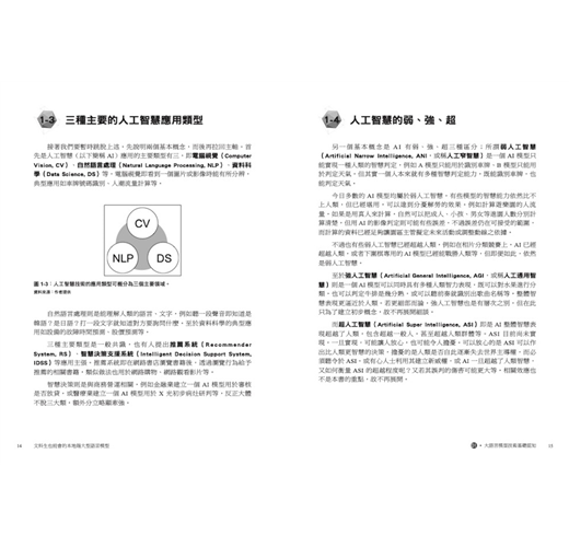 另一個基本概念是 AI 有弱、強、超三種區分;所謂弱人工智慧(Artificial Narrow Intelligence, ANI,或稱人工窄智慧)是一個 AI 模型只能實現一種人類的智慧判定,例如 A 模型只能用於識別車牌、B 模型只能用於判定天氣,但其實一個人本來就有多種智慧判定能力,既能識別車牌,也能判定天氣。