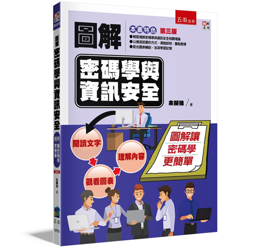 本書特色是以淺顯的內容,每單元搭配簡潔的圖解說明,從最基本的加解密原理、網路環境涉及資安的軟硬體,一直到整體資安運作過程的各個環節,均以深入淺出的方式,提供讀者全方位學習。無論是從事資訊相關行業的人員、身處資訊應用環境的使用者、學生,或是任何對於資安有疑惑的大眾,都能輕鬆學習到符合實務所需的密碼學與資安知識。