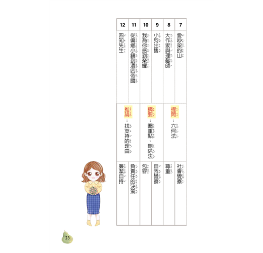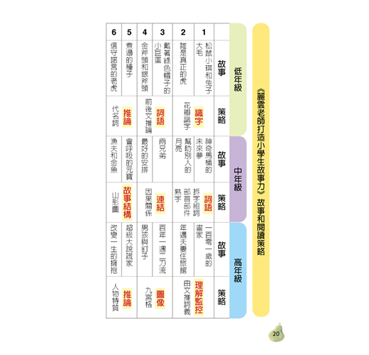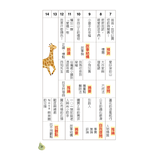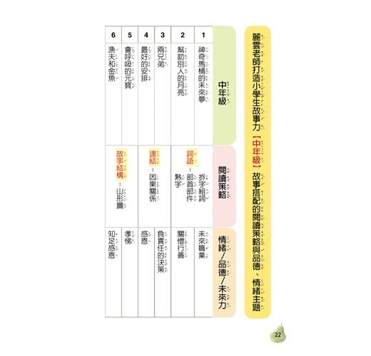 3.邊讀故事邊學習詞彙,為寫作力建立基本功,以及從每種主題的故事,拓展跨領域知識,訓練自我思考,培養正向好品格和學會管理情緒。