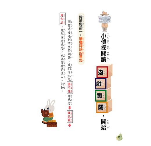 5.每一個故事閱讀前,提供小偵探的叮嚀,幫助小讀者聚焦主題。題型設計成闖關方式,讓學習與遊戲接軌,進行一趟快樂的冒險旅程。