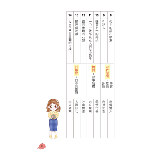 14個有趣的故事帶你闖6大關:理解監控、圖像、推論、自我提問、摘要、找不同觀點等策略,並融入SEL/品德/未來力為一體,從讀好看的故事中,循序學習到閱讀方法,更可以「學什麼,練什麼」,搭配各式圖像組織和探究策略,讓讀故事不再只是讀「閒書」,而是能閱讀越聰慧,擁有思辨力與創造力。