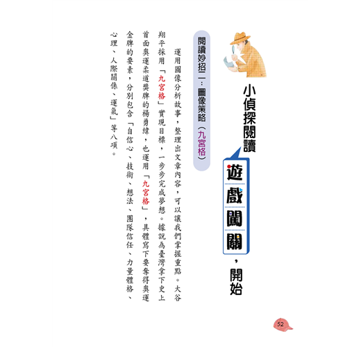 5.每一個故事閱讀前,提供小偵探的叮嚀,幫助小讀者聚焦主題。題型設計成闖關方式,讓學習與遊戲接軌,進行一趟快樂的冒險旅程。