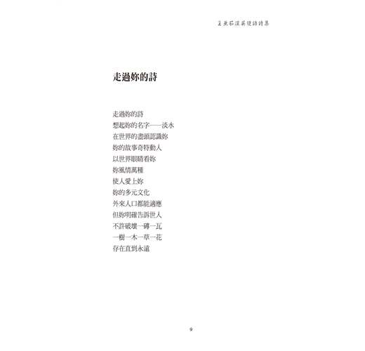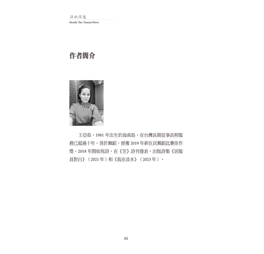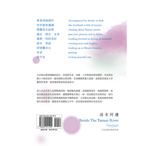 詩人以長年投入長照服務的第一線經驗為底蘊,真誠凝視老年、病痛與親情,也從長期在淡水生活的視角,細緻描摹地方風土。每一首詩都是生活的印記,揉合著淡水的在地文化與照護現場的辛酸與溫柔。王亞茹以詩為橋,牽起家鄉的眷戀與生命的敬重,讓讀者在流轉的文字中,看見愛的重量與存在的光亮。