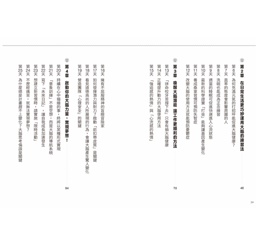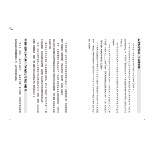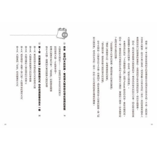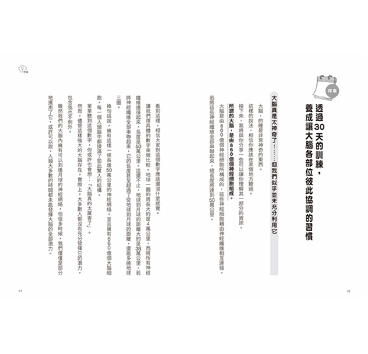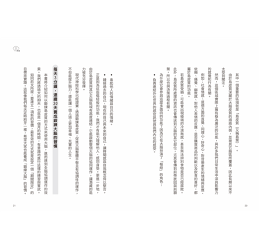 在書中以「很簡單就能改變的日常小習慣」只需透過每天3分鐘只需持續30天的練習方式,讓你有意識地進行這套腦部鍛鍊。增強溝通能力、改善工作效率及發揮意出想不到的大腦潛力。