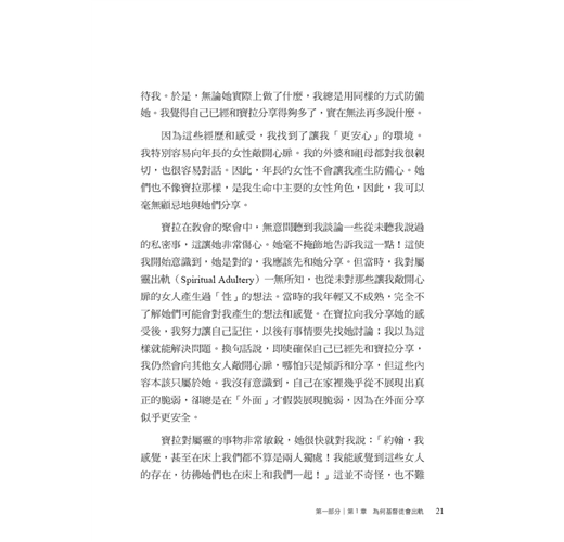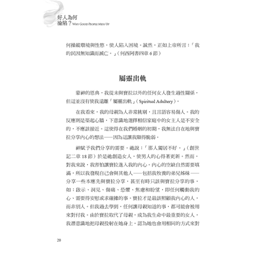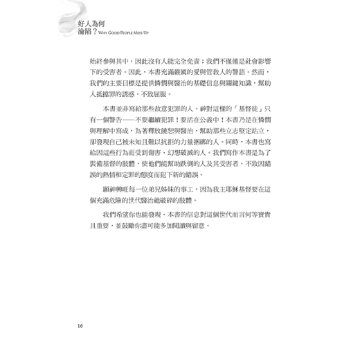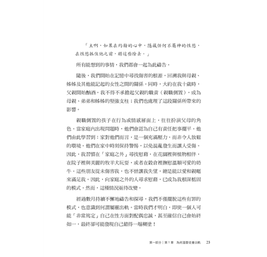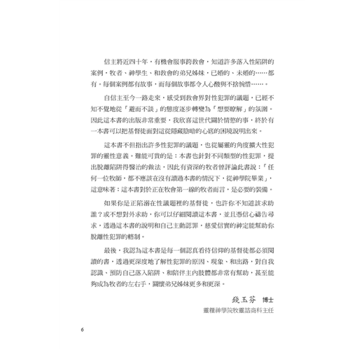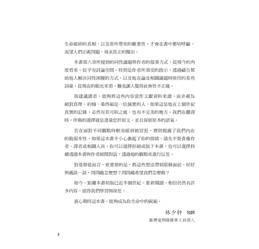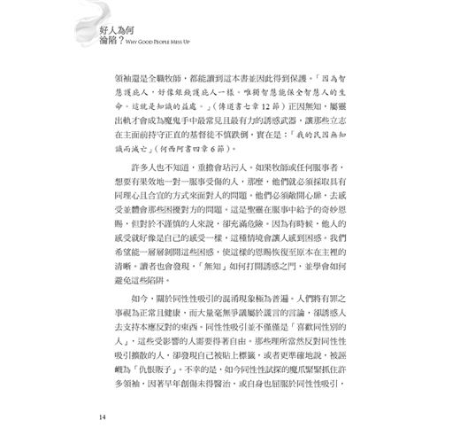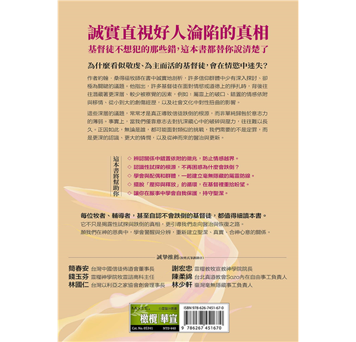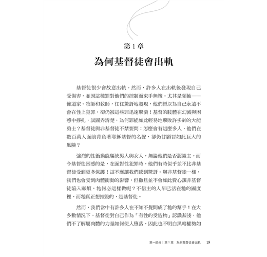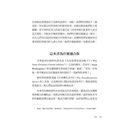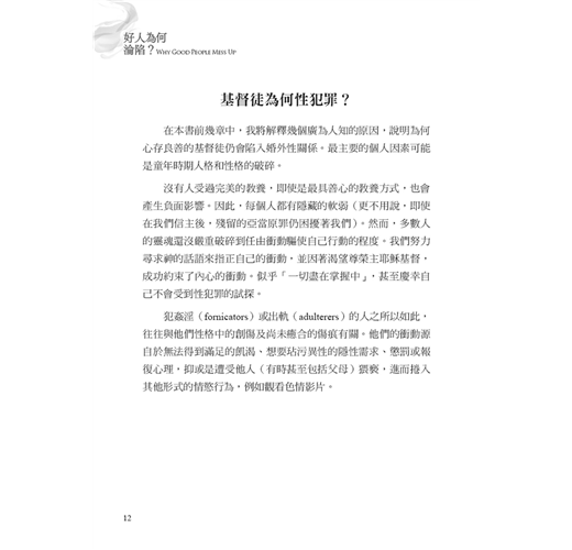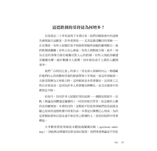 作者約翰.桑得福牧師在書中誠實地剖析,許多信仰群體中少有深入探討、卻極為關鍵的議題。他指出,許多基督徒在面對情慾或道德上的掙扎時,背後往往潛藏著更深層、較少被察覺的因素,例如:屬靈上的破口、錯置的情感依附與移情、從小到大的創傷經歷,以及社會文化中對性扭曲的影響。