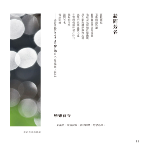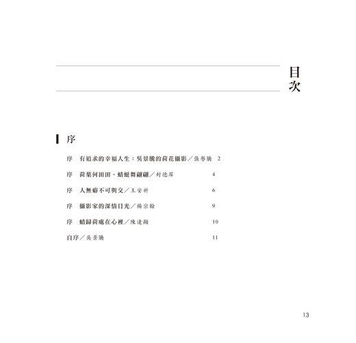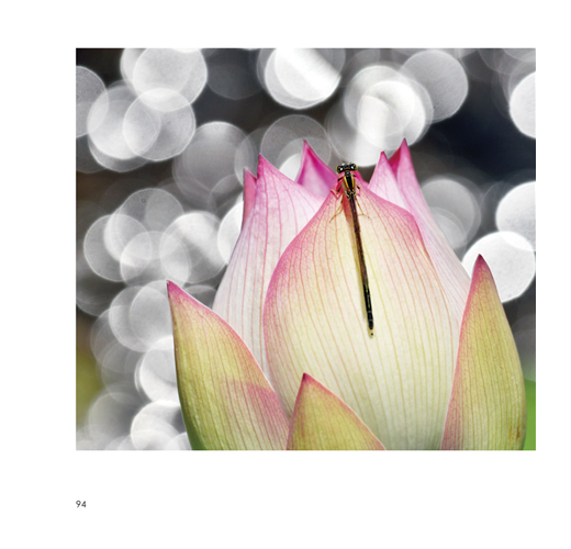 更可貴的是,景騰兄從不藏私,一如既往地其在書中慷慨分享自己的攝影心法。全篇不及千言的〈拍攝荷花與蜻蜓、豆娘經驗談〉,字裡行間滿是前輩對眾人的體貼叮嚀,在平實文字背後,潛藏著他欲把金針度與人的深情。自己寫似乎還不夠,他又邀得臺北市立動物園昆蟲館唐欣潔館長,特別撰文提供關於蜻蜓的專業知識,讓此書增添更多開卷之樂。以景騰兄在攝影界新聞界的資歷,以及曾兩度獲金鼎獎新聞攝影獎、四度獲曾虛白新聞攝影獎等殊榮,卻在退休後仍堅持以紙本書籍為媒介,以傳福音般的不懈熱情,四處奔走,為的就是向世間傳播荷花之美。或許正因為他是一位有情之人,才讓我們在這些精彩影像中窺得,那來自拍攝者的深情目光。