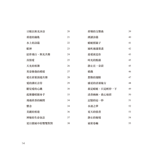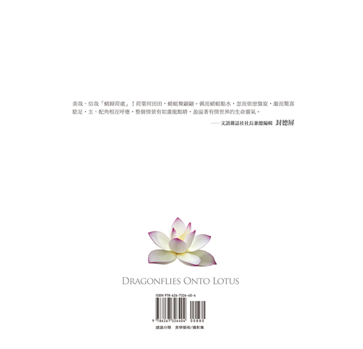 本書特邀作家歐銀釧撰寫詩文,昆蟲生態專家唐欣潔導讀蜻蜓生態,圖文相映,知性與感性並陳,以荷的百態與蜻蜓的靈動,展現自然界永恆流轉的力量與詩意。