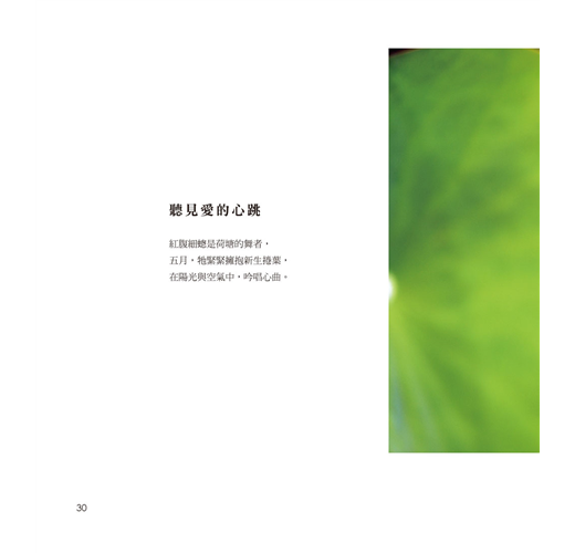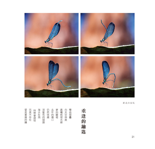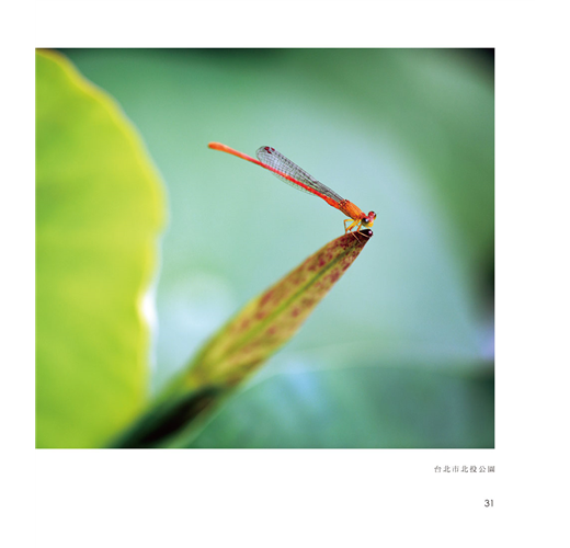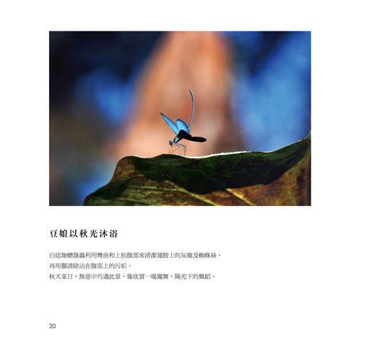 書中精選近兩百幅作品,收錄許多珍貴畫面:有豆娘時而獨舞、時而成雙,在荷尖緩步移動,輕展如水袖般的飛翼,卷葉繾綣成心;也有千載難逢的蜻蜓交配瞬間。每一張照片,都是一場不為人知的守候,一首詩意盎然的生命詩篇。