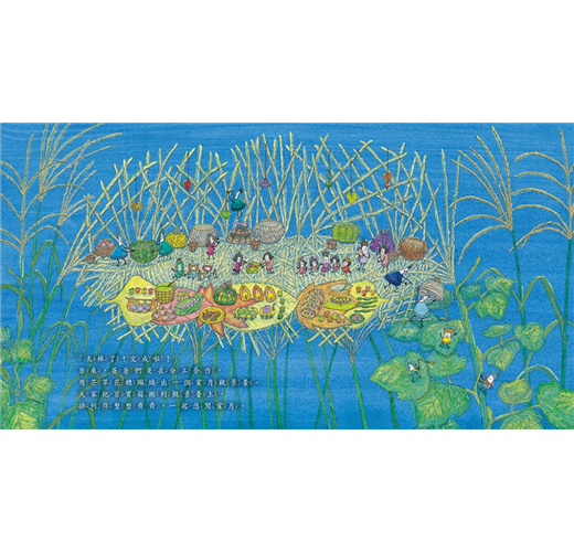 小小鄰和夥伴們在池邊的芒草叢中相聚,