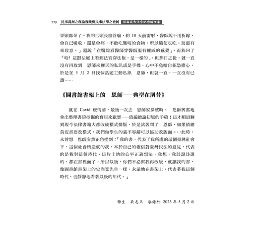 我非常有幸受 恩師王大法官澤鑑教授之邀,一同作為本會成立捐助人之一並擔任董事,得以追隨孫大法官森焱教授及王大法官澤鑑教授等老師前輩先進,從事提昇民事法學研究之風氣,加強學術與實務之互動的工作。嗣承 恩師本會董事及前董事長王大法官澤鑑教授之檯舉及指示,本會各位董事之厚愛,獲選為本會第七屆及第八屆董事長(任期自民國一○九年九月二十三日至民國一一五年九月二十二日),在孫大法官森焱教授擔任董事長時所奠定之良好基礎上,承接重任及推動會務。我擔任本會第七屆董事長期間,因「嚴重特殊傳染性肺炎(COVID-19)」疫情肆虐,致無法舉辦各種研討會,因此看不到孫大法官森焱教授出席研討會,更不幸的是孫大法官森焱教授因跌倒頭部受傷,住院復健期間被感染肺炎,於民國一一一年六月十六日逝世,從此永遠再也看不到孫大法官森焱教授出席研討會之身影,令人不勝欷歔。