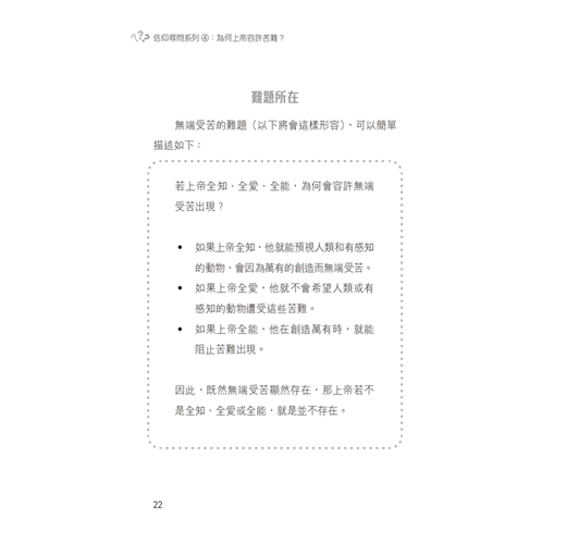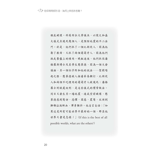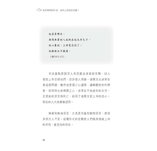 本書是「信仰尋問系列」的第四輯,探討苦難的問題。