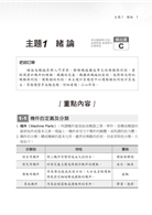 編寫方式以常考的各類主題彙編,老師提示各類主題重點及常出考點,讓你以最有效率的方式學習,卻又能完整吸收所有概念。每章節末收錄精選考古題,讀完課文馬上自我檢測,不熟悉的地方就回頭再讀一次,加深記憶且不容易忘記。