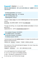 每組關鍵短語都搭配 Expand 的進階延伸說法,訓練以不同角度說出同樣意思,擺脫公式化表達 (例如I think, I believe, There are many...),靈活運用多樣句型與語氣,讓英文更自然、有層次。這不僅能豐富寫作句型,也幫助你在面對口語表達與不同寫作題目時,能靈活調整語氣與句構,展現語言成熟度與邏輯組織力,真正做到表達的多樣性與深度。