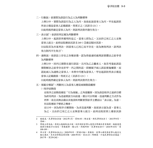 沈冠伶老師近期出版《民事訴訟法(上)》一書,爰增補其相關見解; 另鑑於近來學界亦有諸多文章發表,亦一併補充相關論述,以資參照, 例如:過去法律關係確認、終局判決撤回起訴之再訴禁止,民訴第244 條4 項適用疑義、民訴第56 條與袋地通行權共同訴訟等、證明度降低、原則證明度等。