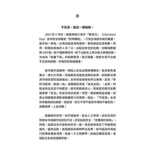 面對崩盤時的恐慌,許多投資者因缺乏系統性理解而做出錯誤決策,例如高槓桿押注反彈導致爆倉,或因帳面虧損而動搖初心、急於停損,甚至後悔未選擇「安全」的定存。然而,作者提醒,單純依賴現金儲蓄同樣承擔高通膨侵蝕購買力的風險。「不投資」並非避險,而是另一種高風險的選擇。