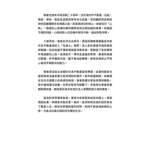 作者以二十餘年在資本市場的深耕經驗,涉足台股、美股、債券、海內外房地產、黃金及虛擬貨幣等多元資產,深入剖析投資的底層邏輯,強調「心態」與「知識」是財富累積的關鍵。投資成功的核心在於「心態」,而穩健的心態來自持續學習與正確「知識」的累積。書中分享了作者如何透過考取日本不動產經紀人「宅建士」執照,深入研究日本房市,成功規避風險並抓住機遇的經歷。這些知識與經驗不僅適用於房地產,更延伸至股市、債市等領域,讓作者練就以平常心面對市場波動的能力。
