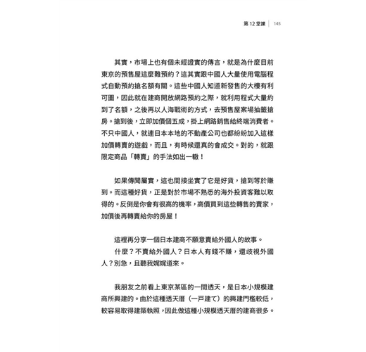此外,作者亦以親身經歷為例,分享如何在日本房市低點精準進場,以及在台股崩盤時冷靜應對的思考過程。最後一堂課則是收錄了作者購買低總價房屋的實戰故事,詳述如何評估「真便宜」與「假便宜」,以及在快速決策中避免踩雷的技巧。這些真實案例不僅生動有趣,更充滿實操啟發,讓讀者能將理論應用於實際投資。