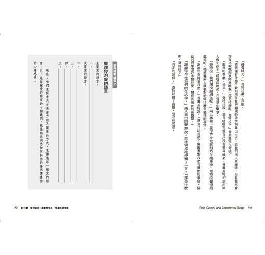 本書附有十一個愛與被愛的練習,幫助我們識別伴侶和自己的感情模式,包括:認識自己的需求、愛的語言、關係信念、壓力反應、心理負荷等等,並進一步解開問題的癥結,最終能維繫一段健康且令人滿足的關係。