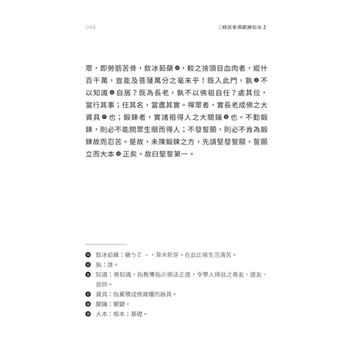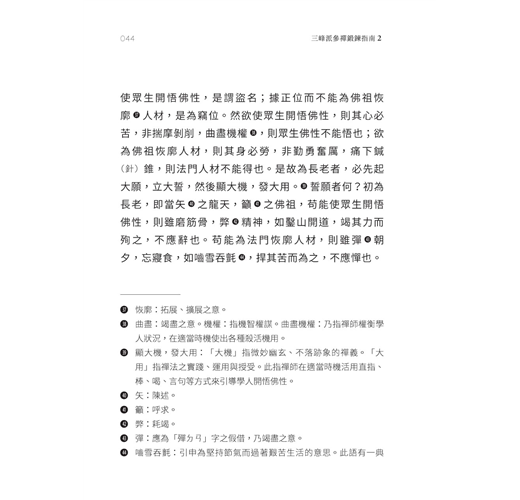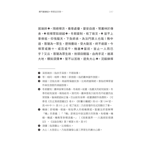 祖師著作之用語,或因時代久遠而有難解之處,以學術著作立場來註解時,本不宜引今釋古,然而本系列既以輔佐一般大眾實修指引、建立實踐連結為目的,因此在註解時,除了引用禪宗典籍之外,也常使用聖嚴法師「禪修指引系列」等修行相關著作解釋之,以協助熟悉法鼓山修行體系的讀者理解祖師意旨,其中又以聖嚴法師主持禪七或禪坐會的開示內容,編輯成書的《禪的體驗.禪的開示》、《拈花微笑》等為主要參考。
