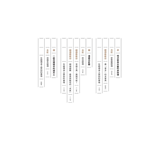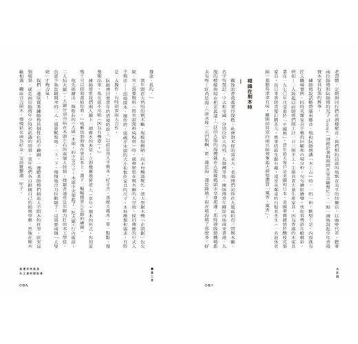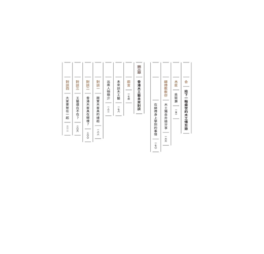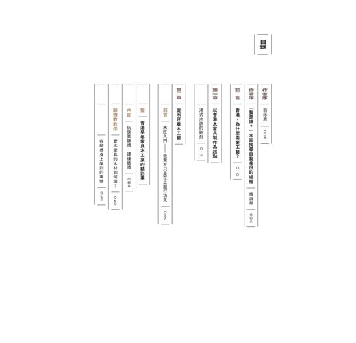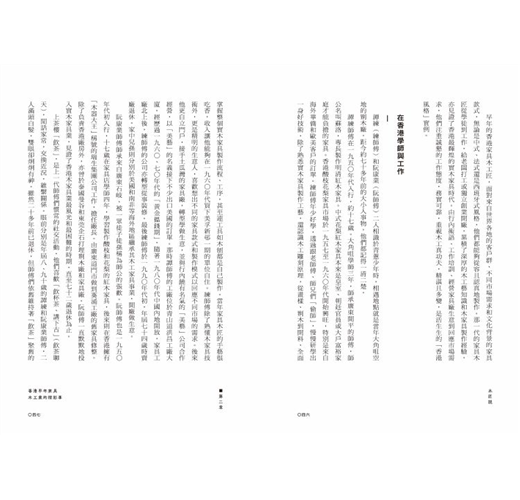 一枱一椅,是家居生活的基本必需品;其背後的匠人工藝、製作產業,也是一個地方,甚至一個城市的重要經濟、文化傳統和創新基礎。香港木家具工藝擁有深厚文化歷史和獨特發展,見證城市經濟起飛,也是本地非物質文化遺產的重要部分。隨著社會現代化的進程,香港木家具工藝漸漸被遺忘,木匠翁泳恩、建築師梅詩華,聯同設計研究者徐巧詩,走訪了不同年代的老中青香港木匠和設計師,以他們自身工藝故事為主幹,記錄了一系列木家具的「香港製造」故事。當中除了傳統中式和西式木家具工藝外,還有木匠的獨門心得,分享他們對物料關懷、工藝培養、傳承創新的想法,是一本訴說香港記憶、木匠精神與未來的文化誌。