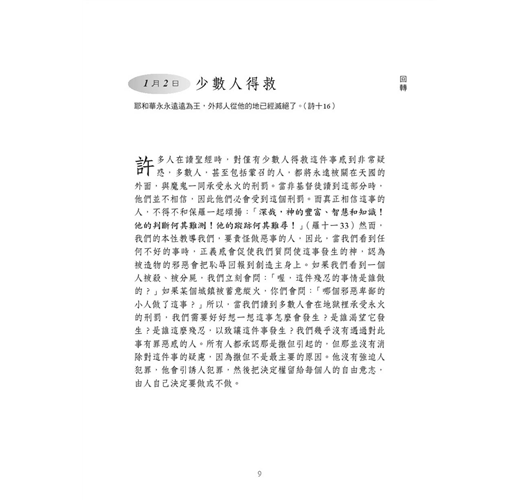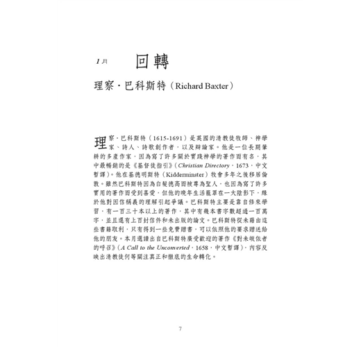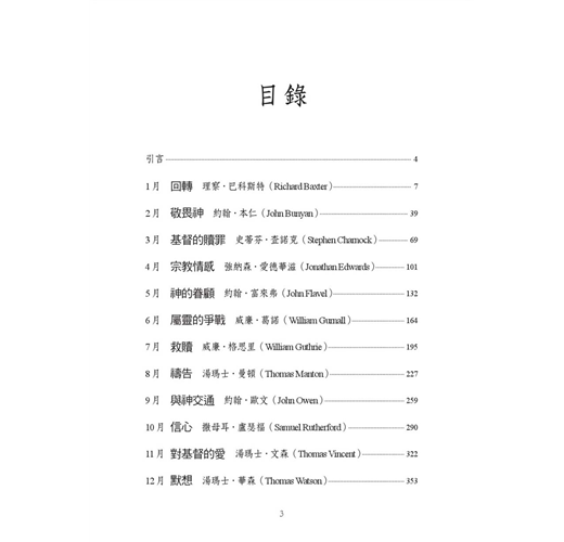 本書收錄十二位著名清教徒作家的作品,先介紹該作家的生平及特色,並各選出一個主題,每月一個,包括:回轉、敬畏神、基督的贖罪、宗教情感、神的眷顧、屬靈的爭戰、救贖、禱告、與神交通、信心、對基督的愛、默想。這些主題都是基督徒常聽到,卻不一定深入了解的信仰道理。本書編排方式為每日一篇,讀者可藉著每日閱讀,沉思這些主題,並藉著每日對應的經文,咀嚼神的話語,讓每一天都能敬虔愛主。
