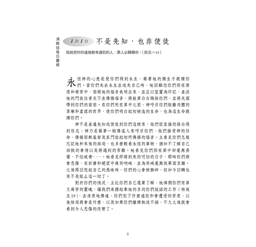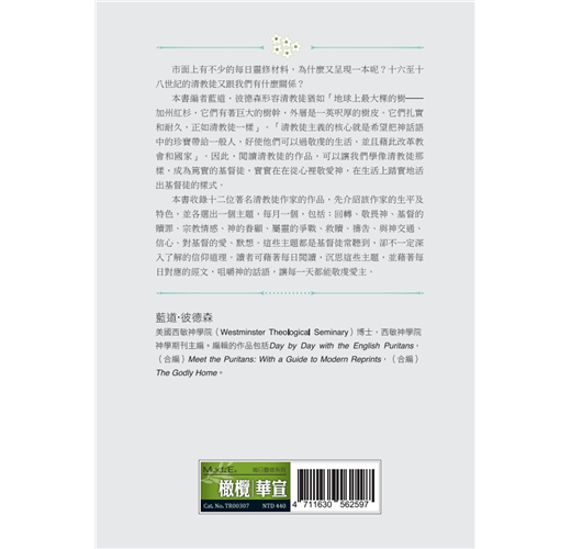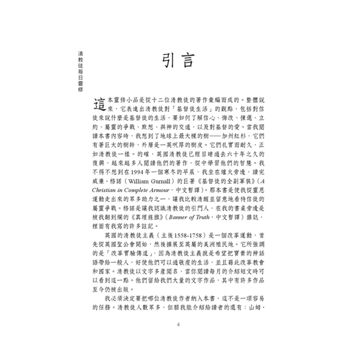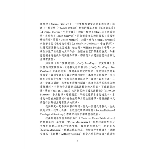 如同在《每日靈修閱讀》(Daily Readings,中文暫譯)系列其他的靈修作品,《清教徒每日靈修》(Daily Readings: The Puritans)主要是提供一種簡要和方便的方式,來閱讀過去的屬靈珍寶。每則文章五分鐘之內就可讀完,本書也易於攜帶,可以放在口袋或皮包裡。在來來往往的路途中,我們可以在火車、公車、捷運上閱讀,或者在等飛機時閱讀,或者作為早晨或晚上的靈修材料。它能夠作為讀者認識清教徒的入門書,不像我與約爾‧畢克(Joel R. Beeke)共同撰寫的《遇見清教徒》(Meet the Puritans,中文暫譯)那樣艱澀,即便它是那本書的補充本。本書的特點在於閱讀材料完全依照每月的主題選擇,這種編排方式將使你對每個主題有更多的認識。
