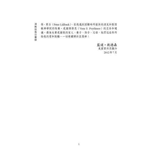 我與畢克一起參與本書的編輯,他是一位現代清教徒,也是我的好友。我衷心祈禱,清教徒改革宗神學院(Puritan Reformed Theological Seminary)在將來的世代繼續祝福教會。