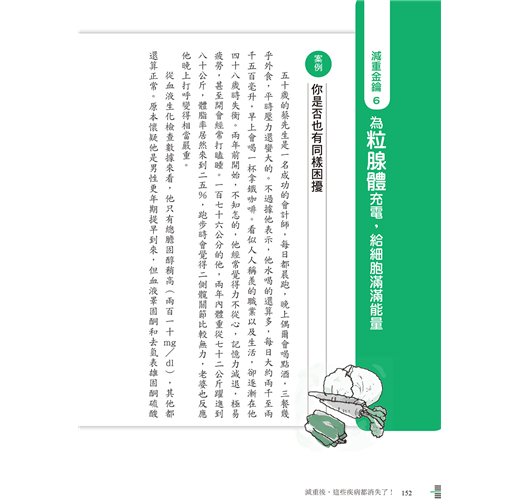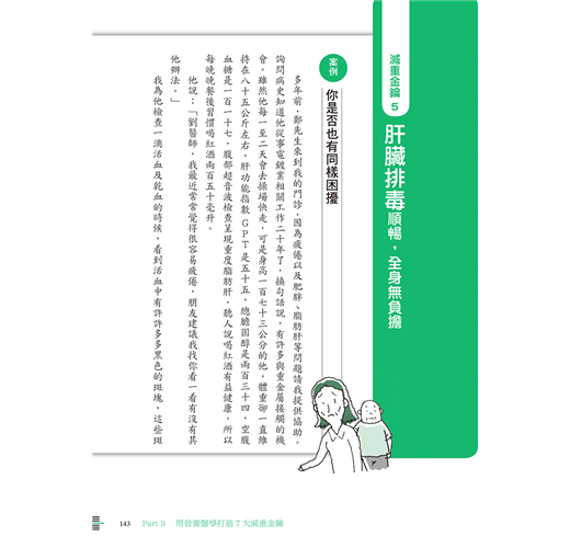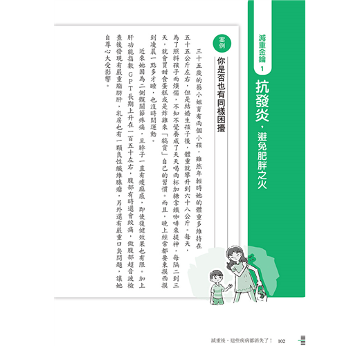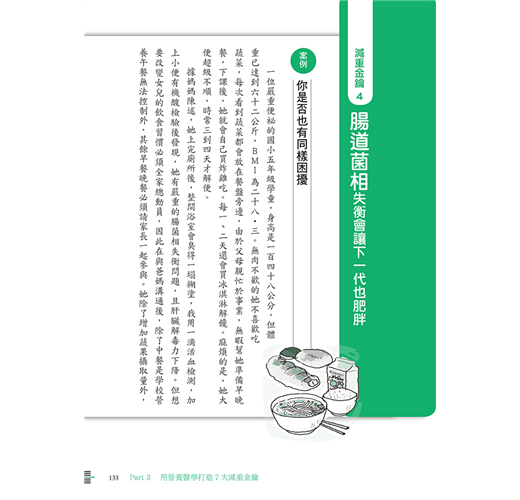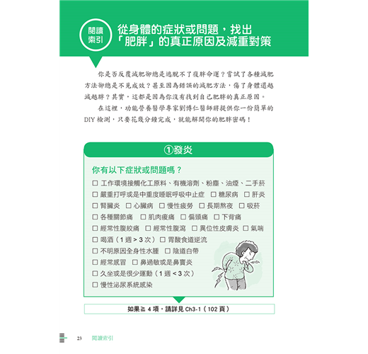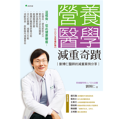 本書是劉博仁醫師繼暢銷書《疾病,不一定靠「藥」醫》、《營養醫學抗癌奇蹟》、《完全根治耳鼻喉疾病》之後,再度以營養醫學的專業搭配主流醫學,協助慢性及重大疾病患者,透過營養醫學健康減重不復胖後,同時各種宿疾不藥而癒的減重專門書!書中特別揭露「營養醫學的7大減重金鑰」,例如:(1)抗發炎,避免肥胖之火;(2)管好內分泌及荷爾蒙,有效控制肥胖;(3)別讓過敏食物,成了減重絆腳石;(4)腸道菌相失衡,會讓下一代也肥胖;(5)肝臟排毒順暢,全身無負擔;(6)為粒腺體充電,給細胞滿滿能量;(7)戒斷甜食,啟動腦內減重革命。同時,書中也針對上述狀況揪出會讓身體肥胖的生活習慣與食物,並提供讀者可以自我保健的金鑰食物及營養補充品建議。