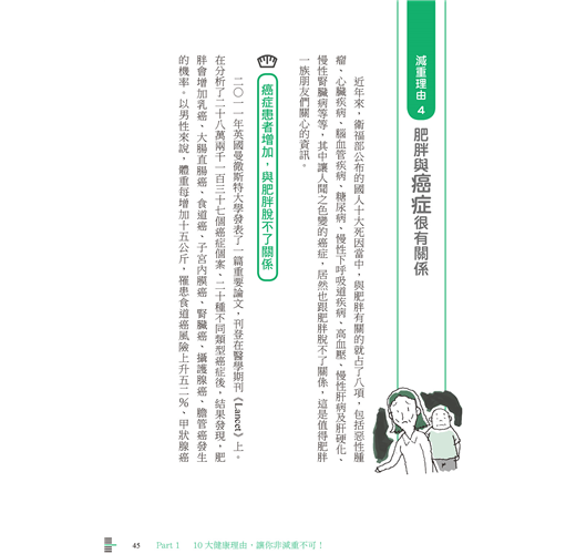 肥胖除了影響美觀、自信和人際關係外,更是危害健康的頭號殺手。你可能不知道,體內許多的生理作用,都是體重超重開始產生變化,且容易引發疾病,例如:高血壓、高血脂、冠心病、糖尿病、腎臟病、癌症等慢性和重大疾病,都和它脫不了關係,甚至骨質疏鬆、退化性關節炎、睡眠呼吸中止症、不孕症,也都是肥胖者難以避免的痛!因此,不論是為了追求健康、長壽,還是重拾自信、活力,擁有良好生活品質和人際關係,減重都是唯一的選擇。