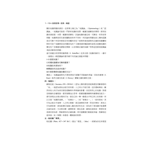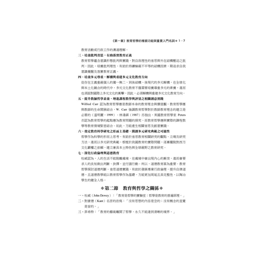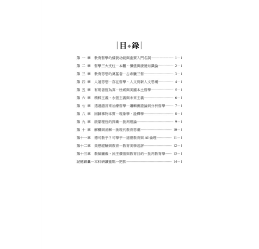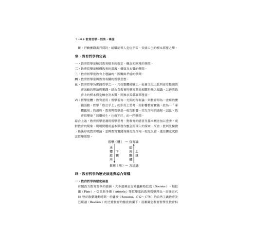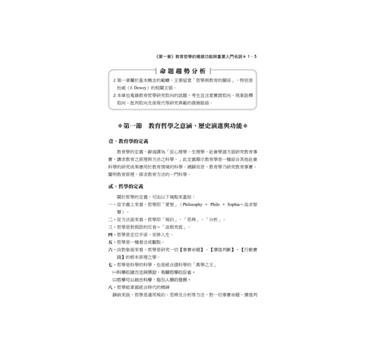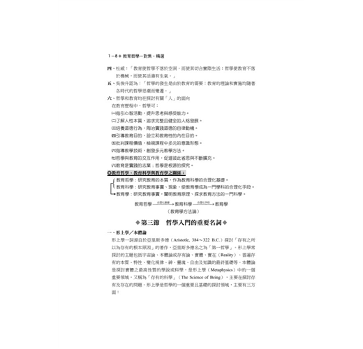 5.基本關鍵,專有名詞羅列析論:教育哲學有一些專有名詞,如形上學、知識論、價值論等,或者古希臘三哲的哲學起源概念,經過有效解明,作為理解本科的堅實基礎。