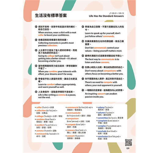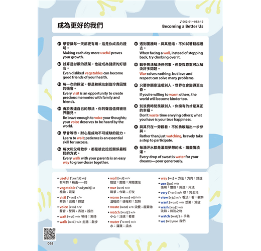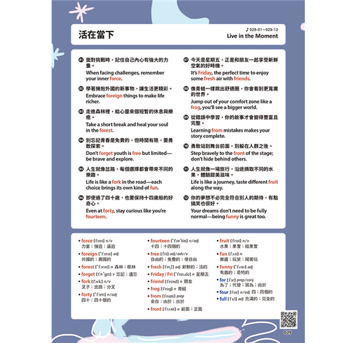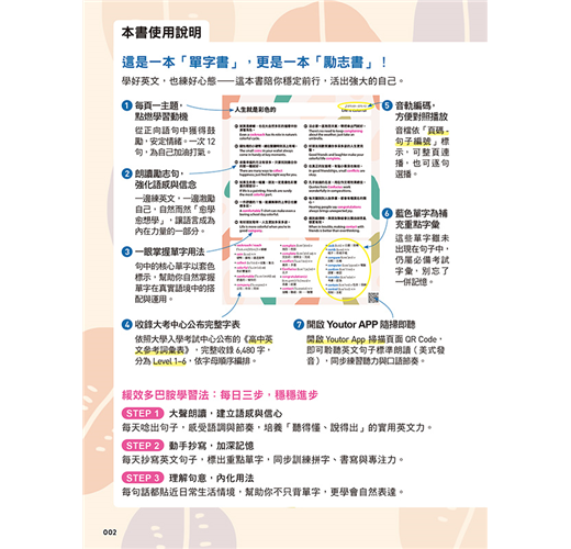 本書中每一句話都經過精心設計,不只幫助你記憶單字,更透過貼近生活的語境,提升語感、句型掌握力與學習動力。單字不再只是抽象的考試符號,而是你表達想法、理解世界的語言工具。
