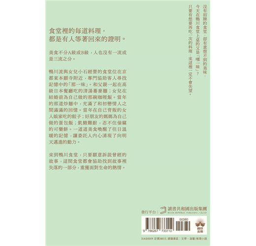 翻譯這部作品時,經常覺得自己像是坐在鴨川食堂的一角,看著一位位客人走進來,靜靜傾聽他們述說屬於自己的故事。書中每個故事的架構簡潔穩定,卻從不重複,因為每段回憶都獨一無二,蘊含著不同的情緒與意義。每一位委託人想要尋找的「那一味」,其實是某段難以忘懷的情感縮影,或是對逝去親人的思念,或是對未竟情誼的追尋。無論是哪一種,「那一味」之所以重要,不只因為好吃,而是承載了委託人的人生片段與未了的心願,看似是為了找回一道菜,其實是找回一段關係、一句來不及說出口的告別,或是一份不願忘卻的溫柔。料理只是媒介,真正觸動人心的,是藏在食物背後的故事。