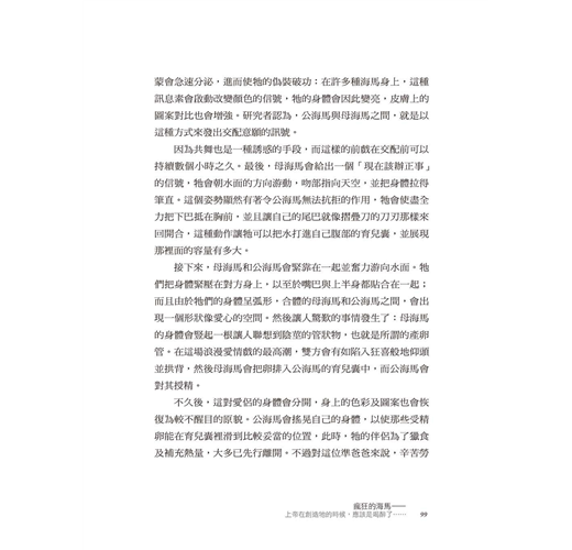 而牠們枯燥無趣嗎?海馬跟會吟唱的座頭鯨與虎鯨一樣,可都是海裡的藝術家;牠在舞蹈表達力與色彩設計這兩方面,尤其才華洋溢。要施展魅力引誘異性時,海馬更是勁道十足-牠們求婚時所跳的熱舞,就連海獅這樣的硬漢都會為之融化。一開始公海馬與母海馬會彬彬有禮地互相致意,接著尾巴末端會彼此交纏,貼近身體舞動並嘀嘀咕咕情話綿綿,有時候牠們會停下來一會兒,把嘴緊靠在一起,就好像在親吻一樣。牠們會反覆繞著對方轉圈,並讓身上閃耀著不同色彩。這樣的求婚舞可以長達九小時,而且相較於人類通常只結一次婚(如果有的話,而且至少就同一個對象而言),海馬每幾個星期就會跳一次這樣的求婚舞。此外,研究海馬行為的學者曾發現,許多海馬一生忠於一個伴侶,直到死亡將牠們分離。然而近來又有研究證明,這種魚也並非總是這樣:依其生活狀態而定,某些海馬也有交換伴侶或集體交尾的傾向。