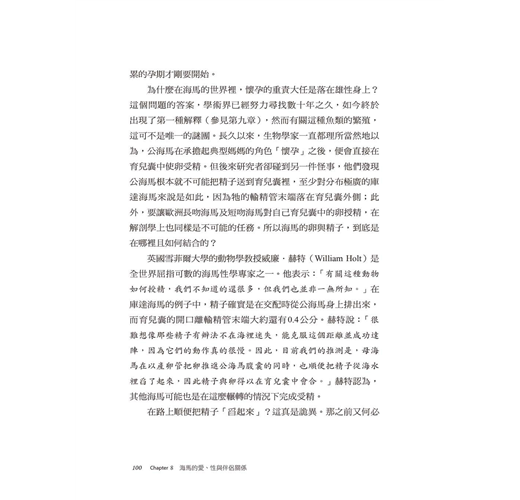 在海馬的世界裡,懷孕生子是男人的事-放眼寰宇動物世界,這可是真正的異數。而這與眾不同的作風究竟是如何且為何形成,全球各地的學者專家都想破解。「雄性懷孕」也為兩性研究者提供了現成議題,讓他們以此為起點探究人類社會中的傳統性別角色。