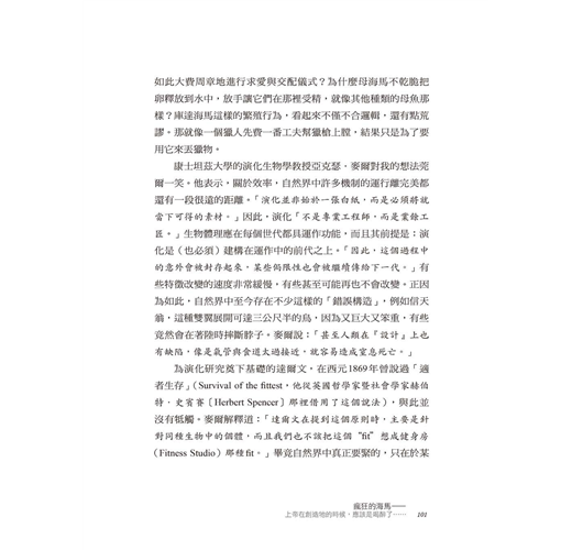 而科學家、設計師或工程師也都相信海馬的力量:二十世紀末的一個日本研究團隊,相信海馬形狀的枕頭能讓人放鬆,特別有益睡眠。牠身體後半部的精巧結構,則啟發了機器人專家建造出更牢固且更靈活的手臂。然而如此不尋常的身體結構,究竟帶給海馬本身哪些好處?牠跟馬或河馬有親屬關係嗎?到底有多少種海馬?我們可以從這種魚身上,學到什麼是真正的男子氣概嗎?牠究竟是如何演變形成的?乾海馬的療效到底有多少真實性?海馬平常是怎麼過日子的?牠適合上班族養來當寵物嗎?澳洲原住民真正崇拜的造物主形象,其實 不是彩虹蛇而是海馬嗎?愛滋病患者會如何受益於這種魚的遺傳基因研究?除了以上種種,本書也探討了這個問題:人類身為海馬的最大天敵,還有辦法保護牠,讓牠免於滅絕一途嗎?