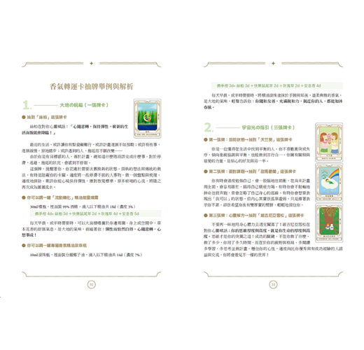 ◎特色1:直覺式牌卡一看就懂,解牌不再生硬艱澀抽象,讓抽牌者的心裡鬱悶和糾結可以馬上化解。每張精油牌卡都有相對應的關鍵字與心靈小語,並詳細解析「目前狀態」、「面對課題」與「心靈解方」。抽牌者只要根據自己需求,選擇抽1張、3張或4張牌卡,翻閱相關精油內容,就可以快速自行解牌,理解牌卡的指引與暗示,療癒自己,並找到自己的命定香氣。