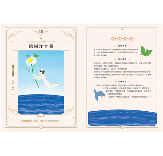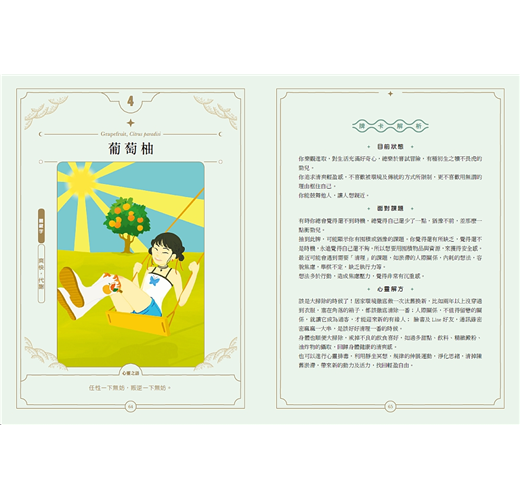 ◎特色3:第一套結合精油能量、調香意境、療癒情緒與自我探索的夢幻牌卡書,讓香氣的學習更加生活化與全面花。每張牌卡皆有精心設計的故事內容與絕美插畫,作者已將每款植物的樣貌,巧妙地融合在畫面中。讀者可以透過插畫繪圖,用精油調香來說故事,並展開內心深處一段自我探索的旅程。你可以以每張牌卡上的插圖做為靈感,善用書中介紹的調香七大核心,就能從容地設計並調配出充滿療癒與和諧的各種香氛作品,幫助你啟動命運之輪,翻轉出人生好運。