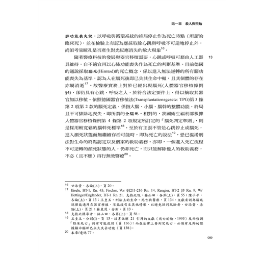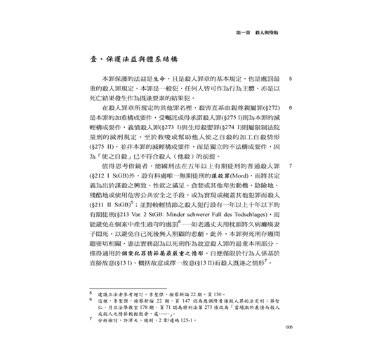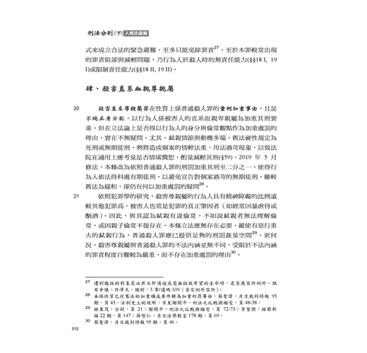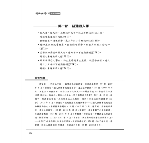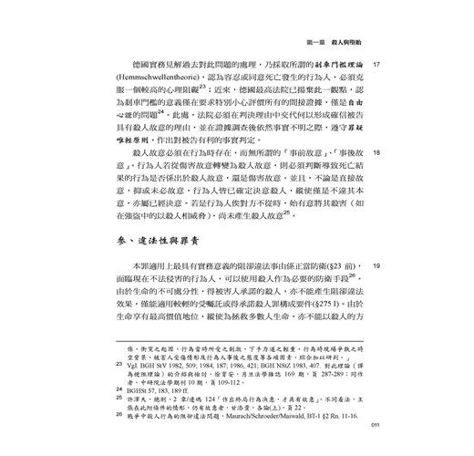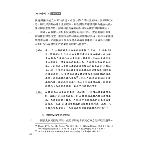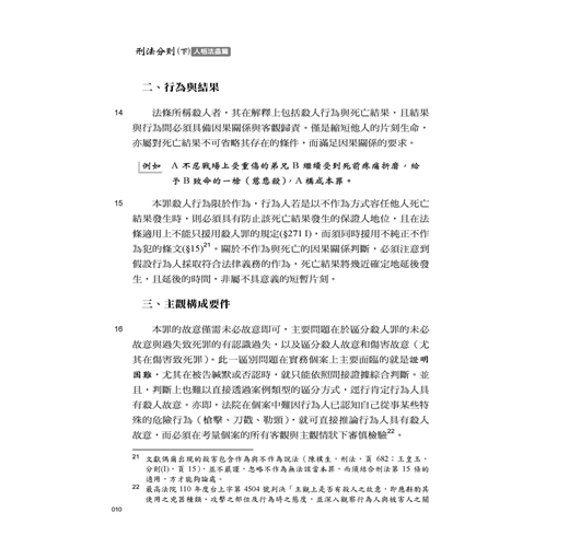 這次改版的主要部分,乃今年5月增訂的罪名:不到庭罪(11章/邊碼24-1~24-3)、影響證人罪(11章/邊碼79-1~79-4)、枉法裁判罪的行為主體(11章/邊碼122)、司法關說罪(11章/邊碼140-147)、自行脫逃(12章/邊碼59-1)。這些罪名固然反映了民意對司法的期待,但也產生不少疑問,如不法關說罪與枉法裁判罪的關係,受關說者配合關說所為是否枉法,受關說者是否也是不法關說罪處罰的對象。除了上述內容外,本版在內文的主要調整處:死亡的判定(1章/邊碼13);殺害直系尊親屬(1章/邊碼20-26);義憤殺人(1章/邊碼27、33);誹謗罪...