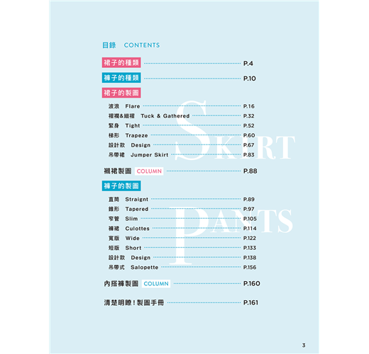 裙裝的種類包括波浪、褶襇&細褶、緊身、梯形、設計款、吊帶裙;褲裝的種類則有直筒、錐形、窄管、褲裙、寬版、短版、設計款、吊帶式,另外,還附有穿搭上很實用的襯裙、內搭褲的製圖。本書適合已經有縫紉基本技能的手作服愛好者,能作為設計時的創意參考,並滿足實際打版操作的技能需求。