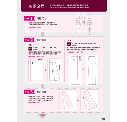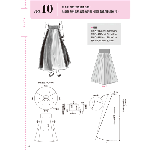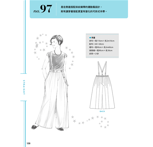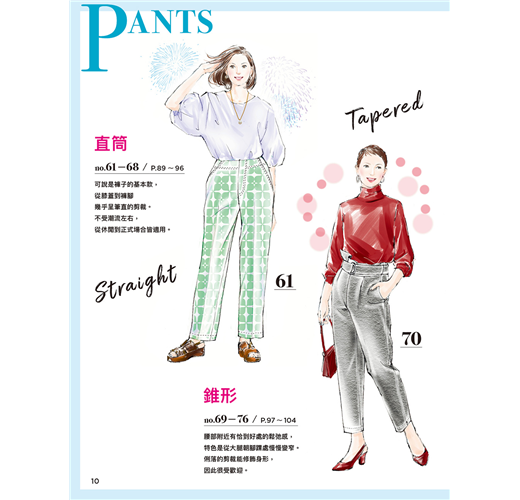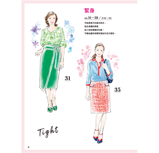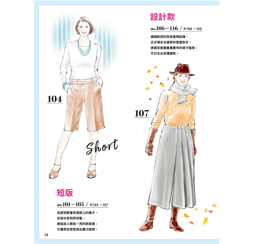 使用插圖呈現穿著樣貌,並提供各款裙裝&褲裝的打版製圖。