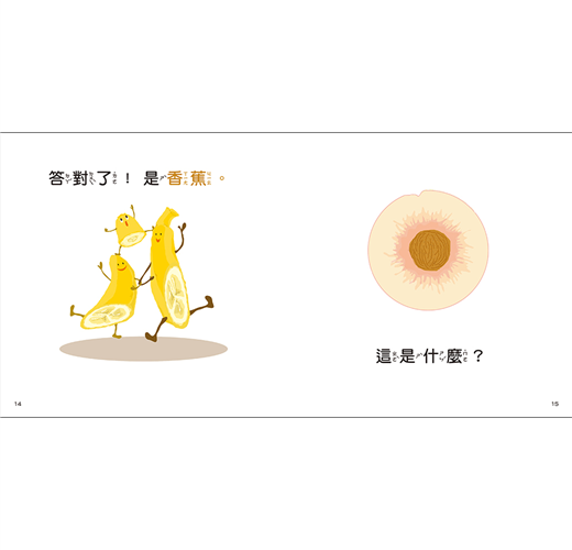 透過「這是什麼?」的猜謎形式引導閱讀,右頁出題、左頁翻揭揭曉答案,建立節奏感與參與感,幫助幼兒在遊戲中認識常見水果,是極佳的食物認知與語言學習起點。