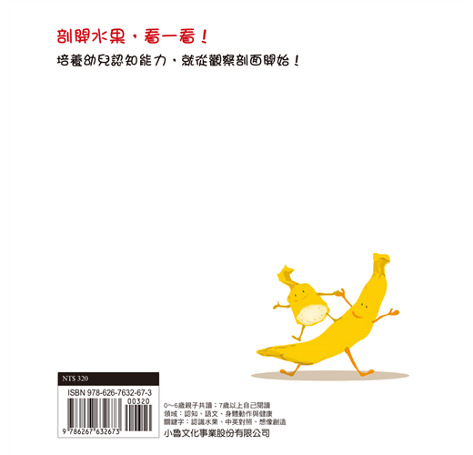 一本詳細描繪水果形狀、外觀及剖面的寶寶書。簡單富節奏的文句,搭配水果們逗趣活潑的表情和姿勢,讓孩子在歡笑中和大人一起認識水果,加深對水果的熟悉度和好感度。本書以各種水果的剖面來貫串全書,以生動有趣的方式呈現水果從整體到部分的形狀,以及內部結構的變化等等,培養幼兒對整體與部分的觀察能力。