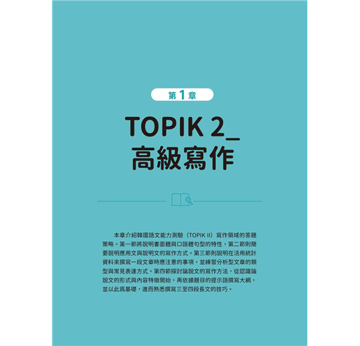 本書第一章,將手把手拆解韓檢中高級寫作第51~54題的命題邏輯與寫作策略,包含應用文、說明文、資料分析文與論說文寫作,並附上注意事項、段落結構教學、可直接背起來的常用寫作句型等,讓你寫出考官眼中的「滿分關鍵句」,妥妥拿到六級!