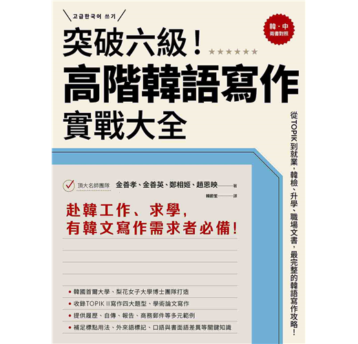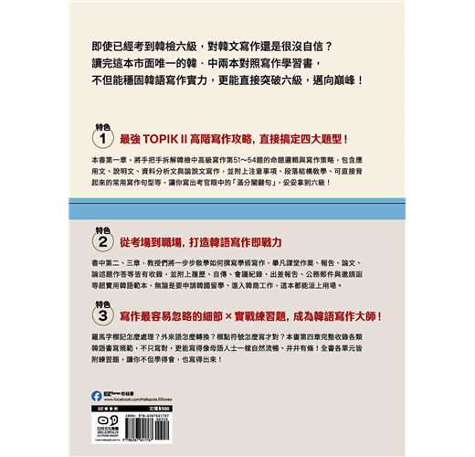完整收錄韓檢中高級寫作題型分析、學術論文、履歷與自傳、工作報告、商務郵件寫作,更有標點符號、外來語標記法、口語與書面語差異等關鍵韓文知識,不但帶你穩固韓語寫作實力,更能直接突破六級,邁向巔峰!