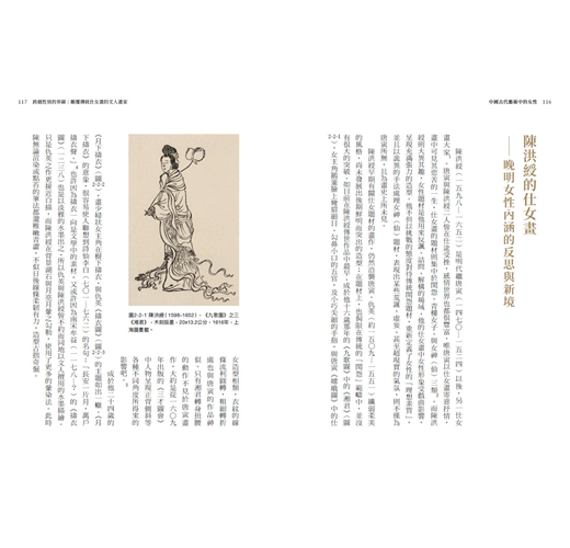緒論首先回顧中國書畫藝術中的女性形象演變:從唐代以前宗教、道德規訓意味強烈的「貞女」,到唐富感官性、宋內省深沉,卻皆不脫男性凝視意味的「美女」,最後到明清時「才女」輩出,女性創作者終於從男性手中取回詮釋女性意象的權力,一些男性畫家描繪女性形象時,也不再視女性為被動的玩賞對象。